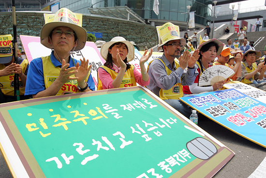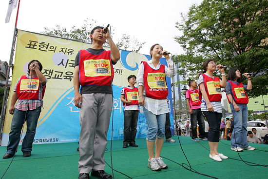 전교조는 5일 오후 2시, 서울역 광장에서 '표현의 자유 보장과 시국선언 탄압 중지, 경쟁교육 반대' 전국 분회장 결의대회를 가졌다.[사진-통일뉴스 조성봉 기자]