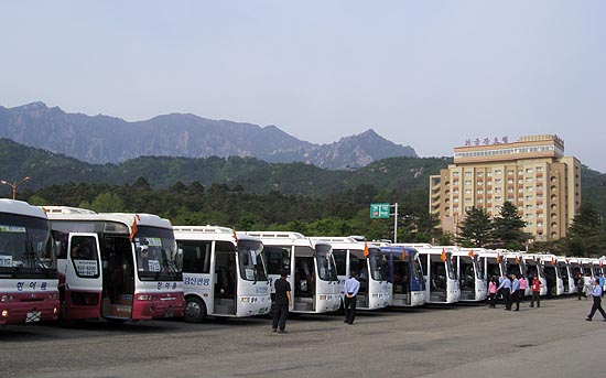 ▲ 지난해 5월 관광이 성황을 이뤘던 금강산 관광지구. 남측 관광객들을 실어온 버스로 주차장이 가득 차 있다. [자료사진-통일뉴스]