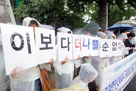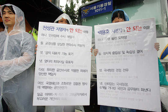 참여연대는 14일 청운동 사무소 앞에서 기자회견을 열고, 검찰총장 후보자 천성관, 국세청장 후보자 백용호의 지명 철회를 이명박 대통령에게 요구했다.[사진-통일뉴스 조성봉 기자]