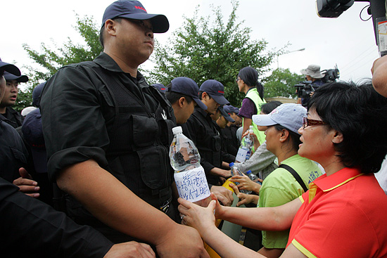 사측에서 고용한 용역들이 식수와 의약품 반입을 요구하는 시민사회단체회원들과 쌍용자동자 노조원 가족들에게 폭력을 행사해 강제해산 시키려 하고 있다.[사진-통일뉴스 조성봉 기자]