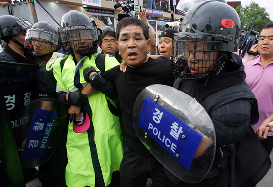민주노동당 소속 보좌관 연행해 항의하던 홍희덕 의원은 경찰에 사지가 들려 질질 끌려 나갔다.홍희덕 의원은 12일째 단식농성 중이다.[사진-통일뉴스 조성봉 기자]