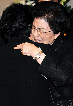 이희호 여사는 김 전 대통령의 빈소 앞에서 헌화와 분향을 하지 않고 계속해서 눈물을 흘렸다. 의료진의 인사를 받은 이 여사는 그 자리에서 오열하기도 했다.