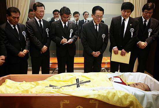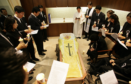 이날 김 전 대통령의 입관식과 천주교 미사가 진행된 1층 안치실은 가족.친지와 측근 50여 명이 참석한 가운데, 슬픔이 짙게 배어 있었다.