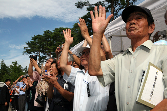 눈물을 쏟는 이들도 있었고, 준비해 온 한반도기를 흔드는 노파도 보였다. 목이 메인지 연방 목청을 가다듬으면서도 "통일"을 연호하는 사람들도 상당수였다.