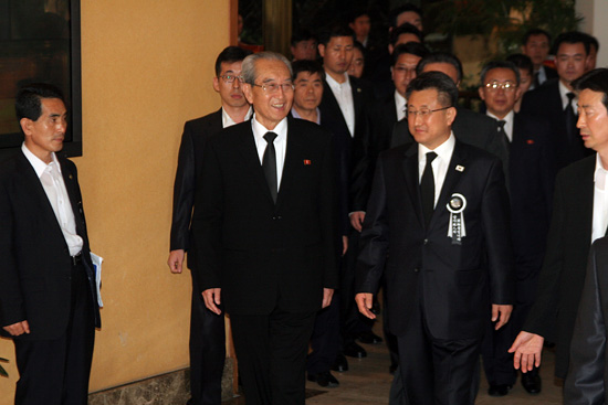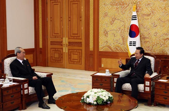 김기남 노동당중앙위원회 비서를 단장으로 한 북측 '특사 조의방문단'이 23일 청와대에서 이명박 대통령을 접견하고 북한 김정일 국방위원장의 구두 메시지를 전달했다.