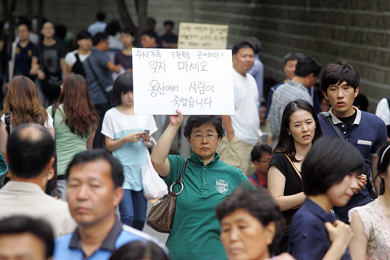 경찰이 대한문 앞 추모대회에 시민들의 참여를 막자, 한 시민이 손피켓을 들고 항의하고 있다. [사진-통일뉴스 조성봉 기자]