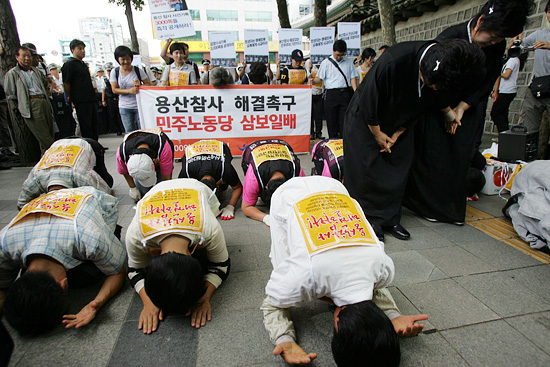 청와대를 향해 삼보일배를 진행하는 민주노동당 의원들과 유가족들.[사진-통일뉴스 조성봉 기자]