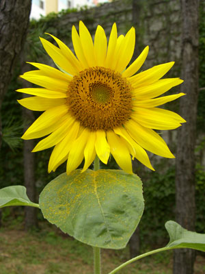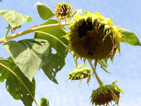 해바라기는 북아메리카 원산인데 일찍부터 이 땅 넓은 지역에서 식재되고 있다. 키가 울타리 너머로 고개를 내밀 정도로 크게 자라며, 소담스레 익어 드리우는 열매는 아주 정겹다. 그 꽃이 해를 향해 고개를 돌린다고 하지만 믿기지 않는 속설이다. 요즘은 밭에 곡식처럼 심기도 하는데, 그 씨로 기름을 짜서 식용도 하고 공업용으로 쓰기도 하는 터다. 들에 피는 돼지감자(뚱딴지)는 같은 족속이다.