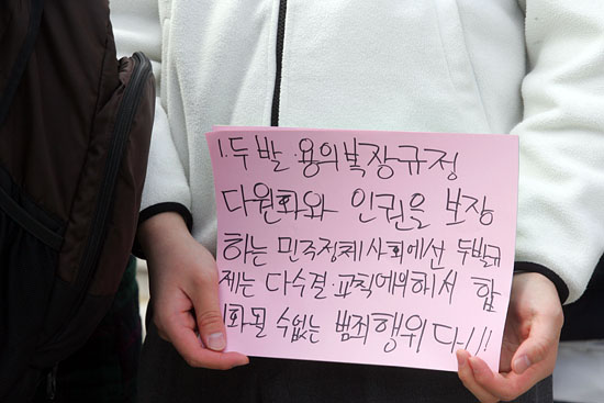 기자회견에 참석한 한 청소년은 '두발규정을 지키지 않으면 전학가겠다'는 서약서를 받는 사건이 발생하는 등 청소년들의 인권을 침해하는 일들이 일어나고 있다며 청소년들의 행복을 위해 '두발용의복장 규정'은 사라져야 한다고 호소했다.[사진-통일뉴스 조성봉 기자]