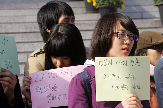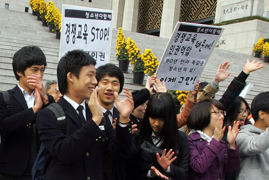 '학생의 날' 80돌을 맞이하는 3일, 세종문화회관 앞에서 21세기청소년공동체 '희망',참교육학무모회, 전교조 등 청소년단체, 교육단체들은 '청소년들이 행복해지기 위해 없어져야 할 5가지 키워드-두발복장규정, 학생이라는 편견, 2MB정권, 0교시및 야간자율학습, 체벌'를 선정해 발표했다.사진은 5가지 키워드를 적은 종이를 버리는 청소년들의 퍼포먼스.[사진-통일뉴스 조성봉 기자]