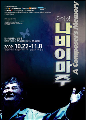 윤이상, 그는 나고 자란 땅에서 억울하게 간첩 혐의를 받았고 스트라빈스키, 슈톡하우젠, 카라얀 등 150여명의 세계적인 예술가들의 구명요구로 2년 만에 옥에서 풀려났다. 조국이 ‘독재’와 ‘군사정권’의 어둠을 헤매고 있을 때 교향시 ‘광주여! 영원히’, 칸타타 ‘나의 땅 나의 민족이여’를 작곡하며 조국의 민주화를 염원한 음악가이고 미국 뉴욕 브루클린 음악원의 교수진이 선정한 ‘사상 최고의 음악가’ 44명 중에 한 사람이지만 고국에서는 잊혀진 사람, 하지만 늘 분단된 조국을 기억한 음악가, 그가 연극 ‘윤이상 나비이마주’로 다시 태어났다.