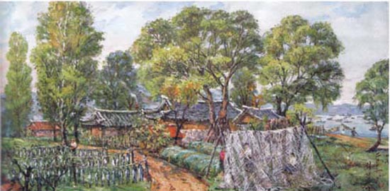 특히 남북민간교류 차원의 미술 전시에서 좀처럼 만나보기 어려웠던 유화 작품의 출현은 눈여겨 볼만하다. 어촌마을의 풍요로운 일상을 섬세한 묘사 기법으로 수채화처럼 맑게 그린 리경숙의 ‘어촌마을’(2001년작)과 같은 기법으로 활기 넘치는 온정각의 풍경을 담은 정온녀의 ‘사랑의 온정각’(2007년작), 멀리 평양의 고려호텔이 비추는 창가에 놓인 화병에 만개한 꽃을 탐스럽게 그려낸 김덕조의 ‘정물’(1999년작) 등은 최근 10여년 사이에 그려진 유화 작품들이다.