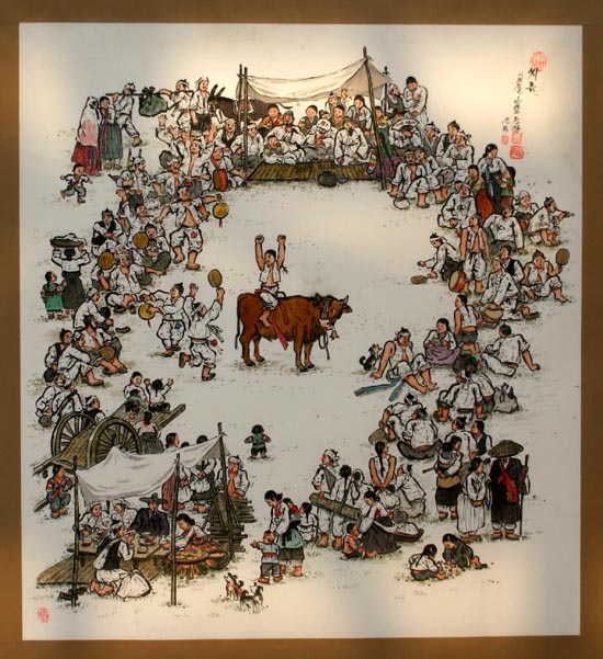 젊은 나이에 공훈예술가가 된 리혜옥(37세)의 ‘봄나들이’는 매화꽃이 활짝 핀 어느 봄날 살이 토실토실 오른 장닭이 새끼 병아리들과 햇살을 즐기고 있는 그림은 나른하고 한가한 봄날의 여유가 그대로 전해지는 듯 하다.