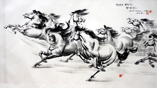 힘찬 단붓질 기법을 사용한 오은별(29세)의 ‘태양은 빛난다 달리자’는 마치 그림 속 말들이 화폭 밖으로 뛰어 나오는 듯한 착각이 들만큼 박진감과 생동감이 넘쳤다. 2살 때부터 그림을 그렸다는 오은별은 인민예술가 오광호의 딸로 아버지로부터 미술의 기초를 배운 뒤, 최성룡 화백의 사사를 받았다고 한다. 7살 때 모스크바에서 열린 국제 어린이미술전람회에서 1등상을 받는 등 촉망받는 신세대 작가이다.