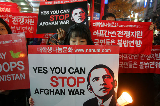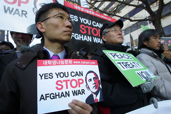 18일 오전 아프간재파병반대연석회의는 버락 오바마 미 대통령이 방한하는 18일 미 대사관 인근에서 기자회견을 열었다.[사진-통일뉴스 조성봉 기자]