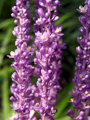 맥문동은 숲속 그늘진 데서 자라는 늘푸른여러해살이풀(常綠多年草)이다. 긴 잎이 무더기로 나고, 그 사이에서 꽃대가 솟아 7~8월에 자주색 이삭꽃을 피운다. 10~11월에 걸쳐 물렁열매(漿果)가 까맣게 익었다가 스스로 터진다. 요즘은 공원이나 녹지에 많이 식재되고 있다. 뿌리(塊根)는 약에 쓰고, 동생 뻘인 개맥문동은 키도 작고 꽃 색깔도 좀 연하다.