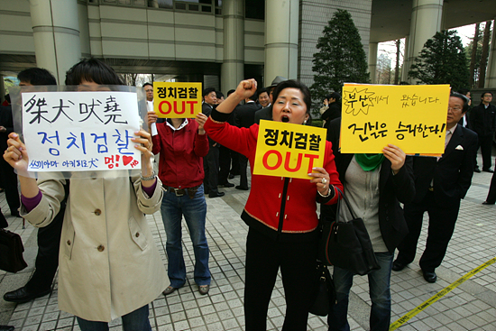 한 전 총리가 법정으로 들어가고 있는 가운데 지지자들이(맨우측) '무'를 들고 한 전 총리의 무죄를 외치고 있다. [사진-통일뉴스 조성봉 기자]
