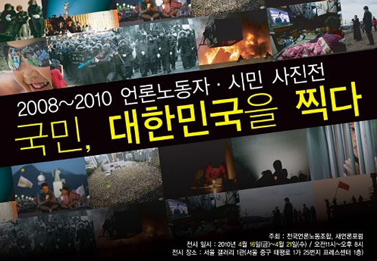 전국언론노동조합(위원장 최상재)과 새언론포럼(회장 현상윤)은 이명박 정부 출범 2년을 조명하는 사진전 ‘국민, 대한민국을 찍다’를 오는 16일부터 21일까지 서울 중구 태평로 한국프레스센터 1층 서울갤러리에서 연다.
