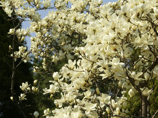 거기에 버금가는 일가붙이에 노란 꽃으로 피는 황목련 꽃잎이 잘게 갈리는 별목련 북미 원산인 멋쟁이 태산목 엉성한 꽃을 다는 일본목련 등 권속이 어울려 꽃동산을 이룬다