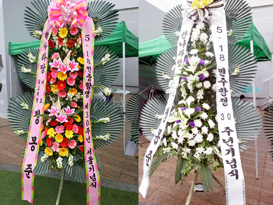 서울광장에서 열린 기념식장에는 서울지방보훈청, 전남대, 재경광주일고 동창회 등 조화 속에서 유독 한 화환이 주목받았다.