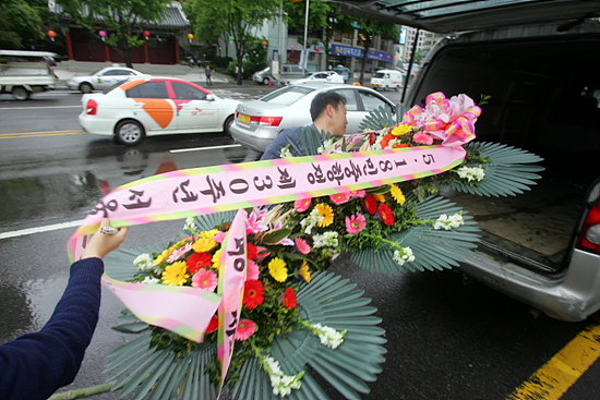 화환을 교체하러 온 꽃집 배달원은 기자의 질문에 손사레를 치며 "한나라당에서 급히 바꿔달라는 요청이 있었다. 행정상의 오류인 것으로 안다"며 급하게 자리를 떴다.