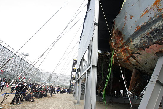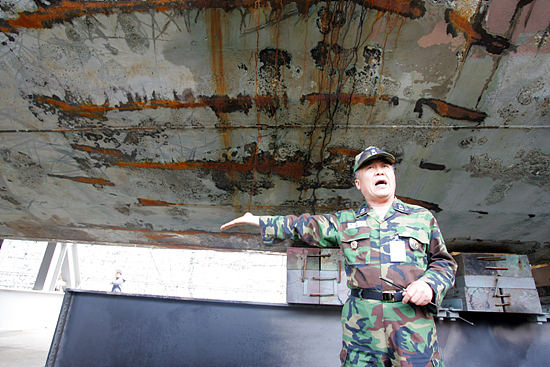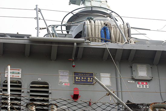19일 오후 평택 해군 2함대에 보관되어 있는 천안함 선체는 높은 펜스는 둘러 싸여 있었다. 입구에 들어서자 함수 부분 위에서 떨어져 연돌 부분이 먼저 눈에 들어왔다. 연돌 아랫부분의 철판은 찢겨 나간 채 위로 말려 올라가 있었으며 각종 전선과 내부 부품이 늘어져 있었다.