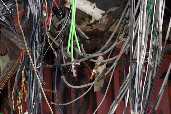 절단면은 각종 전선들이 뒤엉켜 축 늘어져 있었다. 전선 피복은 벗겨지지 않았으며 불에 탄 흔적도 없었다. '어뢰 공격설'을 부인하는 측에서는 어뢰 폭발이 있었으면 전선이 벗겨져 있거나 탄 자국이 있어야 한다고 지적한다.