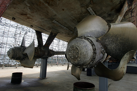 함체 맨 뒤쪽에 위치한 좌.우 스크루는 아래쪽 날개가 절단되어 있었고 우측 스크루의 나머지 날개들은 대부분 시계 반대 방향으로 심하게 휘어져 있었다.