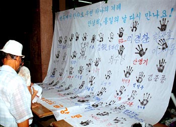 | 2000년 8월 26일 오후 4시 30분 비가 내리는 가운데 도착한 김영달(67세)씨를 시작으로 52명의 비전향장기수들이 통일 그림판에 손도장을 찍었다 |