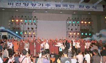 | `비전향장기수 범국민 환송식`에서 비전향장기수들이 손을 들어 참석자들의 연호에 답하고 있다. |