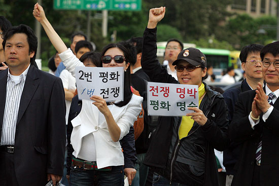 정부의 대북강경 조치로 한반도 전쟁위기감이 고조되는 가운데, 27일 오후 2시 시청 서울광장에서 애국단체협의회 등 보수단체 회원들은'북한응징 결의 국민대회'를(아래), 오후 6시 광화문광장에서 한반도평화를위한비상시국회의는 '생명과 평화의 서울마당'을(위) 개최했다.[사진-통일뉴스 조성봉 기자]