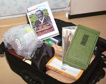 | 우용각(71세)씨의 가방. 왼쪽으로 작은 돌멩이를 병에 담아 포장한 것, 문익환 선생님의 비디오 테이프, 은수저 등이 있다. |
