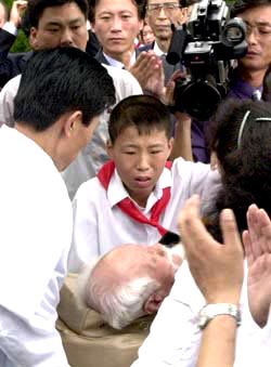 | 류한욱(90세)씨가 들것에 실려 판문점 북측지역을 넘어서자 환영 나온 한 북한 소년이 눈물을 흘리며 맞이하고 있다. (동아닷컴) |