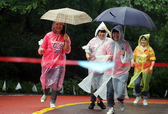 비가오는 궂은 날씨에도 불구하고, 12일 오후 4시 남산공원에서 6.15 10돌 기념 6.15마라톤대회가 열렸다.마라톤 행사 시작을 알리자 한반도기를 흔들며 환호하는 참가자들.[사진-통일뉴스 조성봉 기자]