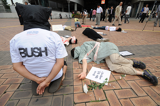 22일 오후 상암 월드컵 경기장에서 열린 '6.25전쟁 60주년 기념 평화기도회'에 참석한 보수성향의 기독교인들이 사회자의 인도에 따라