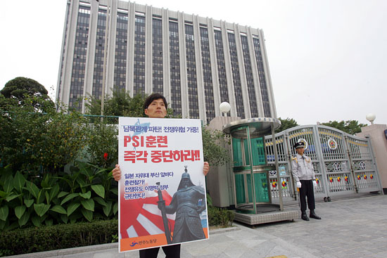 13일, 14일 이틀동안 부산 인근 바다에서 진행된 PSI훈련에 대해 시민사회단체의 1인시위가 미대사관 앞,광화문 일대에서 진행됐다.[사진-통일뉴스 고성진 기자]