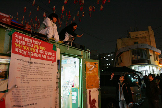 19일 저녁 7시 서울 금천구 가산동 구 기륭전자 사옥터 농성장에서 '불법파견에 대한 고용 책임'등을 요구하는 금속노조 기륭전자 분회원들의 촛불문화제가 열렸다.사진은 구 기륭전자 사옥터를 매입한 코츠디앤디(주)의 농성장 철거에 맞서 포크레인에 위에 올라가 농성 중인 송경동 시인과 김소연 분회장.[사진-통일뉴스 조성봉 기자]
