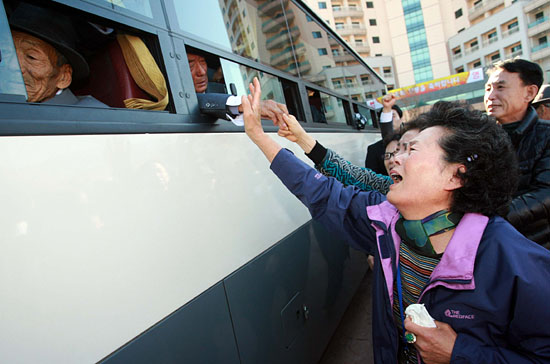 작별상봉 내내 북측 오빠 김진원(80)씨의 품에 안겨있던 남측 여동생 진녀(69)씨는 버스에 매달려 울부짖었다. 버스 창문 너머 오빠의 말은 들리지 않았다. 창문은 이내 습기에 차 오빠 얼굴이 뿌옇게 흐려졌고 창문에는 손바닥 자국만 덕지덕지 남겨졌다. 분단의 벽과 같은 창문을 사이에 두고 두 남매는 손을 맞댔다. 진녀씨는 "문도 못 열게 하느냐"며 통곡했고, 버스에 시동이 걸리고 나서야 창문이 열렸다. 버스가 움직이기 시작할 때까지 작은 창문을 통해 맞잡은 남매의 손은 떨어지지 않았다.