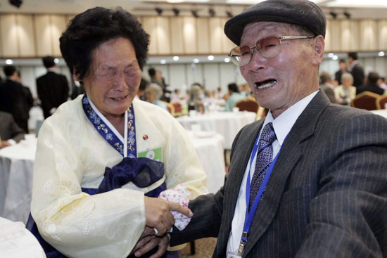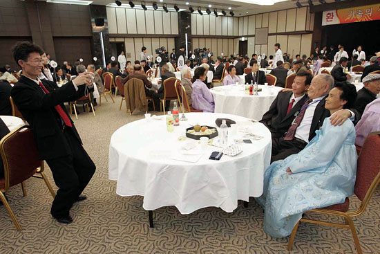 이날 만찬에 참석한 남북 이산가족들은 60년 만의 첫 만남이었던 오전 '단체상봉' 때보다는 한결 여유로워진 모습으로 지난 60년간 떨어져 살아온 얘기들을 주고받으며 서로에게 음식을 떠먹여주거나 술을 건네기도 했다.