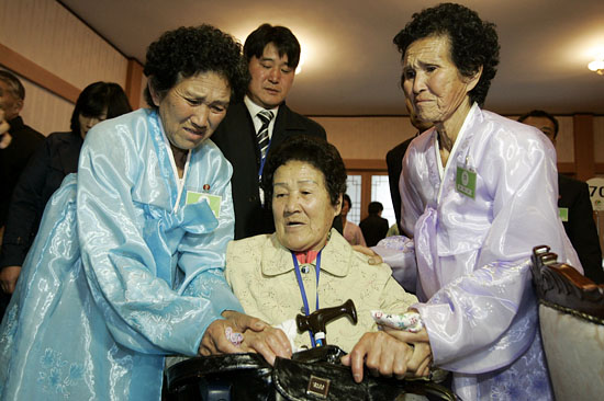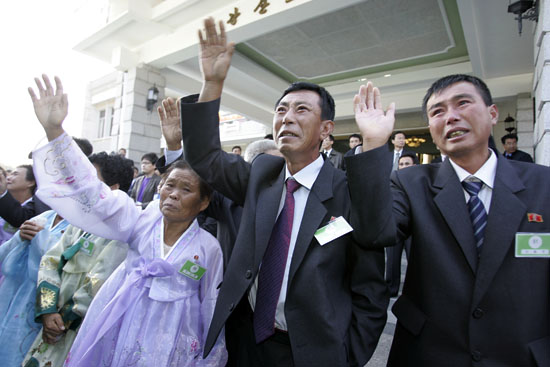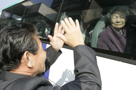 버스에 앉아 쏟아지는 눈물을 닦아내던 남측 가족들은 필사적으로 차창을 두드리며 북측 가족들에게 “여기야 여기”를 연발했다.남측 조윤수(78)씨는 흐르는 눈물을 주체 못하는 북측 여동생 조명수(73)씨에게 “오빠 걱정마라.100살까지 살 테니”라고 말하다 함게 울어버렸고, 한신옥(90) 할머니는 버스 밖에서 손 흔드는 북측 아들 김광윤씨와 ‘고향의 봄’을 합창한 뒤 “기쁘다”고 외쳤지만 얼굴은 눈물범벅이 돼있었다.