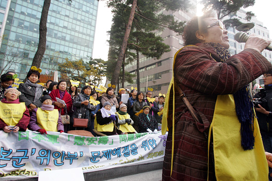 지난 20년동안 할머니들과 일본군 '위안부'문제 해결을 위해 수요시위에 참여한 정대협 윤미향 상임대표(오른쪽).할머니들이 힘든 싸움속에서도 웃음을 잃지 않을 수 있었던 것은 윤 대표처럼 늘 함께 해준 이들이 있었기 때문이다.[사진-통일뉴스 조성봉 기자]