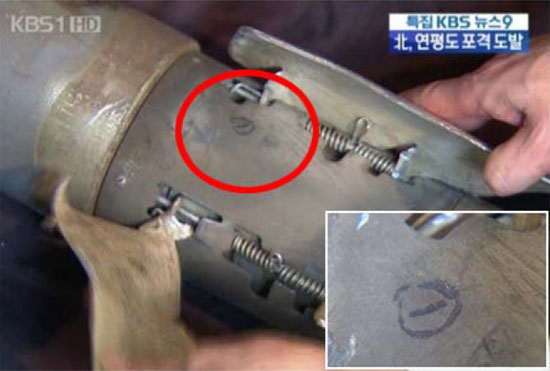 ▲ 연평도에 떨어진 북한 포탄 잔해에 ‘①’이 씌여져 있다. 27일자 KBS <뉴스9> 방송 장면.