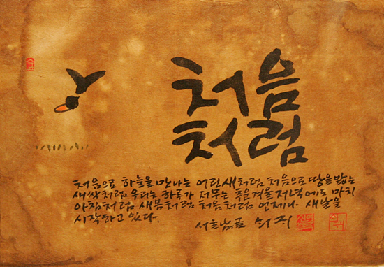 주요 작품으로는 신영복 선생의 글씨로 유명한 '처음처럼' 원본을 비롯해 '곽탁타전', '당무유용', '함께하면 길이 된다' 등 7점과 임옥상 화백의 '결국 내가 혁명이다', '여강여목', '모두 하나다' 등 13점, 박재동 화백의 '목련', '터진 감', '노무현' 등 21점, 이철수 판화가의 '남한강', '좋은 인연', '여기서' 등 18점이 선보였다.