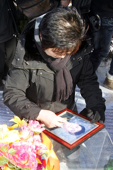 용산참사 2주기를 맞아 20일 낮 12시 마석모란공원에서 열린 추모식에서 유가족들이 영정 앞에 헌화를 하고 있다. [사진-통일뉴스 조성봉 기자]