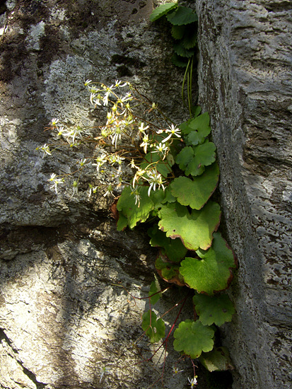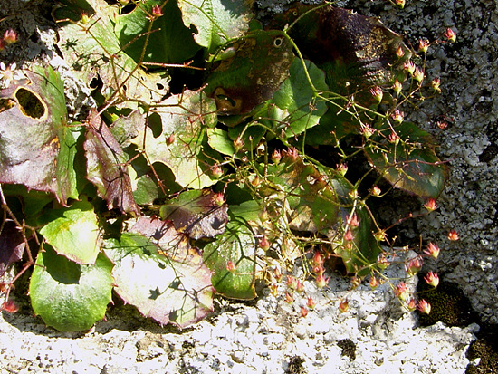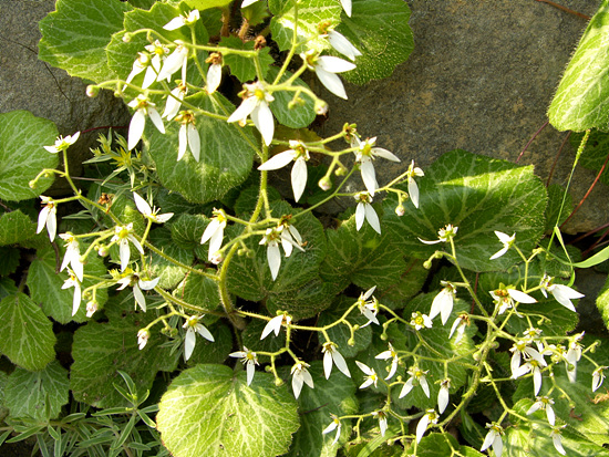 바위취는 축축한 그늘이나 바위틈을 좋아하는 여러해살이풀이다. 콩팥 모양의 이파리가 범의 귀를 닮았다고 해서 ‘범의귀’라는 별명도 갖고 있다. 땅을 기는 줄기를 따라 퍼지며 5~6월에 흰 꽃을 피운다. 위쪽 세 가닥 꽃잎에 빨간 무늬가 있고, 아래쪽 두 가닥 꽃잎은 팔자수염 모양을 하고 있다. 한겨울 눈 속에서도 푸르름을 유지하는 악착이다. 참바위취ㆍ바위떡풀 등 일가붙이가 많은데, 대개 높은 산 바위틈에서 자란다. 그래서 ‘바위취’인가 보다.