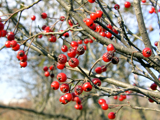 잎이 다 지고 난 가을 긴 꽃자루 끝에 주렁주렁 새빨갛게 익어 드리우는 열매