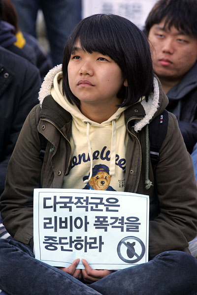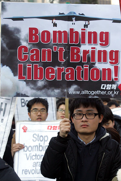26일 오후 4시 종로구 보신각 앞에서 반전평화연대(준), 민주노동당, 다함께 등 200여명의 시민사회단체 회원들은 '다국적군의 리비아 폭격 규탄 집회'를 열었다.[사진-통일뉴스 조성봉 기자]
