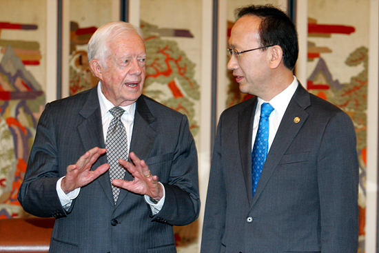 평양에서 돌아온 지미 카터 전 미국 대통령과 현인택 통일부 장관이 29일 오후 4시 30분부터 45분 가량 서울 삼청동 남북회담본부 2층 접견실에서 만났다.