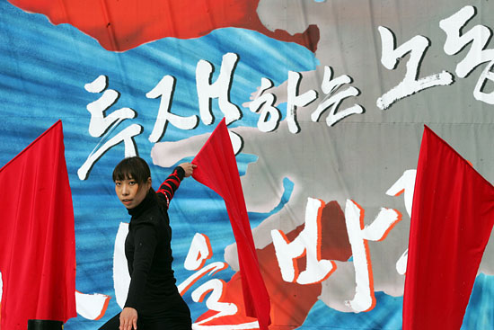 1일 오후 서울 여의도 문화마당에서 한국노총 주최로 열린 121주년 세계 노동절 기념식에서 이용득 한국노총 위원장을 비롯한 지도부들이 정부의 노동운동 탄압에 맞서 싸우겠다는 상징의식으로 화형식을 하고 있다.[사진-통일뉴스 조성봉 기자]