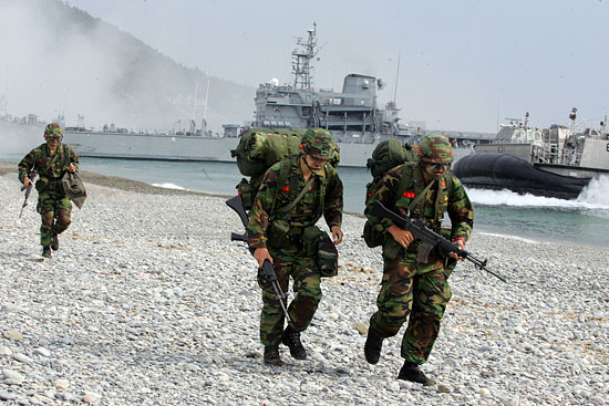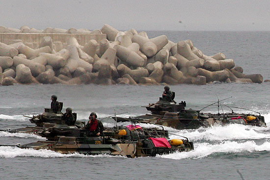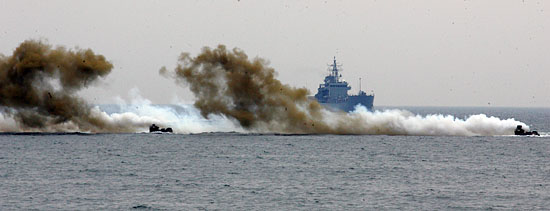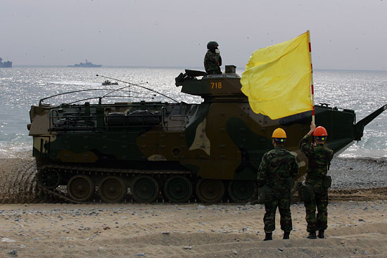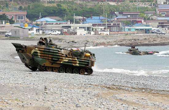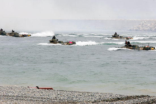 ▲19일 경북 포항시 조사리 해안에서 실시된 육·해·공군 합동 상륙훈련에서 힌국형 상륙 돌격 장갑차(KAVV)들이 해안으로 돌진하고 있다. 이번 훈련에는 독도함을 비롯한 한국형 상륙돌격 장갑차, 공군 KF-16, F-4 전투기 등이 참가했다. [사진-통일뉴스 조성봉 기자]